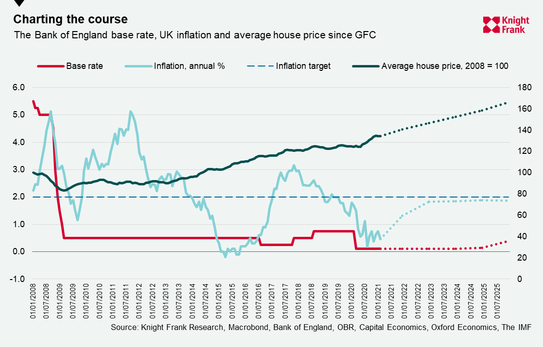 It’s worth pointing out that Capital Economics aren’t an outlier. Average forecasts from Oxford Economics, the OBR, and the Bank of England suggest no rate rises until at least 2025, which would have ramifications for everything from house prices to economic stability and inequality. It would also represent a new phase in an experiment that started back in 2008 during the Global Financial Crisis (GFC), before which the base rate had never been below 2%.