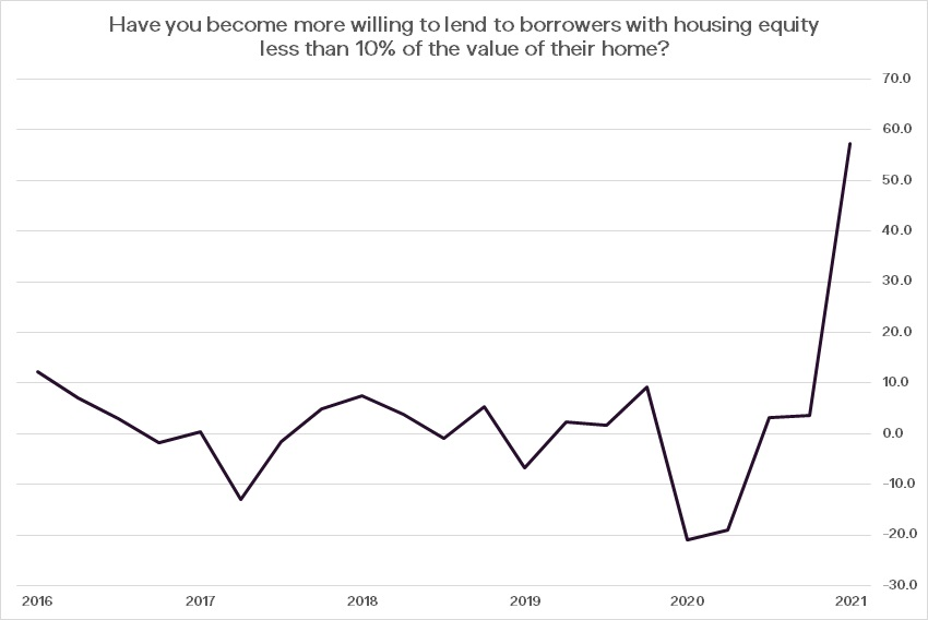 A net balance of +37.6 of survey respondents said they planned to increase mortgage lending over the next three months, the highest reading on record. Meanwhile, willingness to lend to borrowers with small deposits has soared to a net balance of +57.2 (see the chart below).
