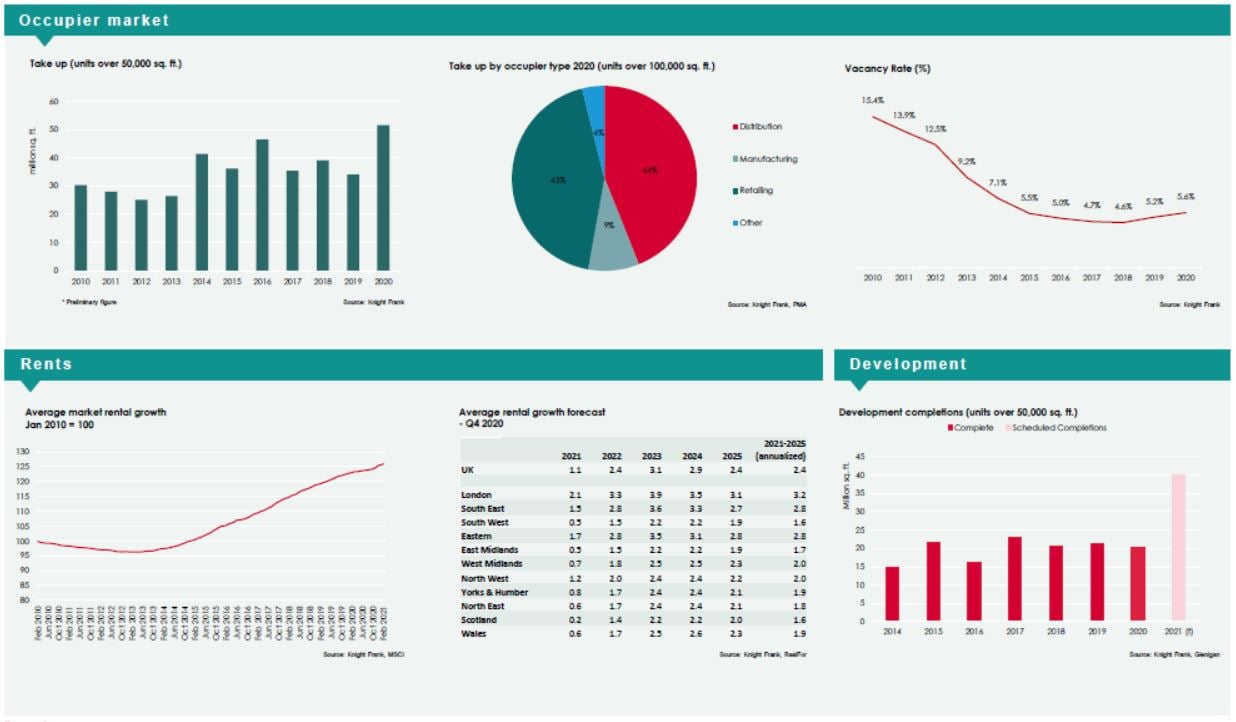 - Warehouse take-up for 2020 totalled a record 51.6m sq ft in 2020. This exceeds the previous record in 2016 when 46.4 million sq ft was taken.