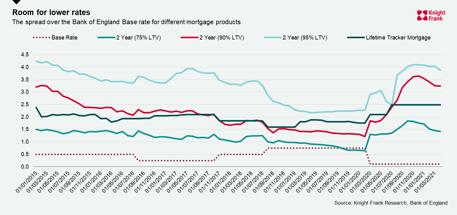Banks increased their margins in 2020 in response to heightened economic risks. The difference between the base rate and the rate on mortgage products – also known as the spread – is well above pre-pandemic norms. It’s most notable in higher loan-to-value (LTV) products; the average spread for 2-year products at 90% LTV is 1.2% higher than it was before the pandemic. While this has improved in recent months, it remains at its highest level since 2015.