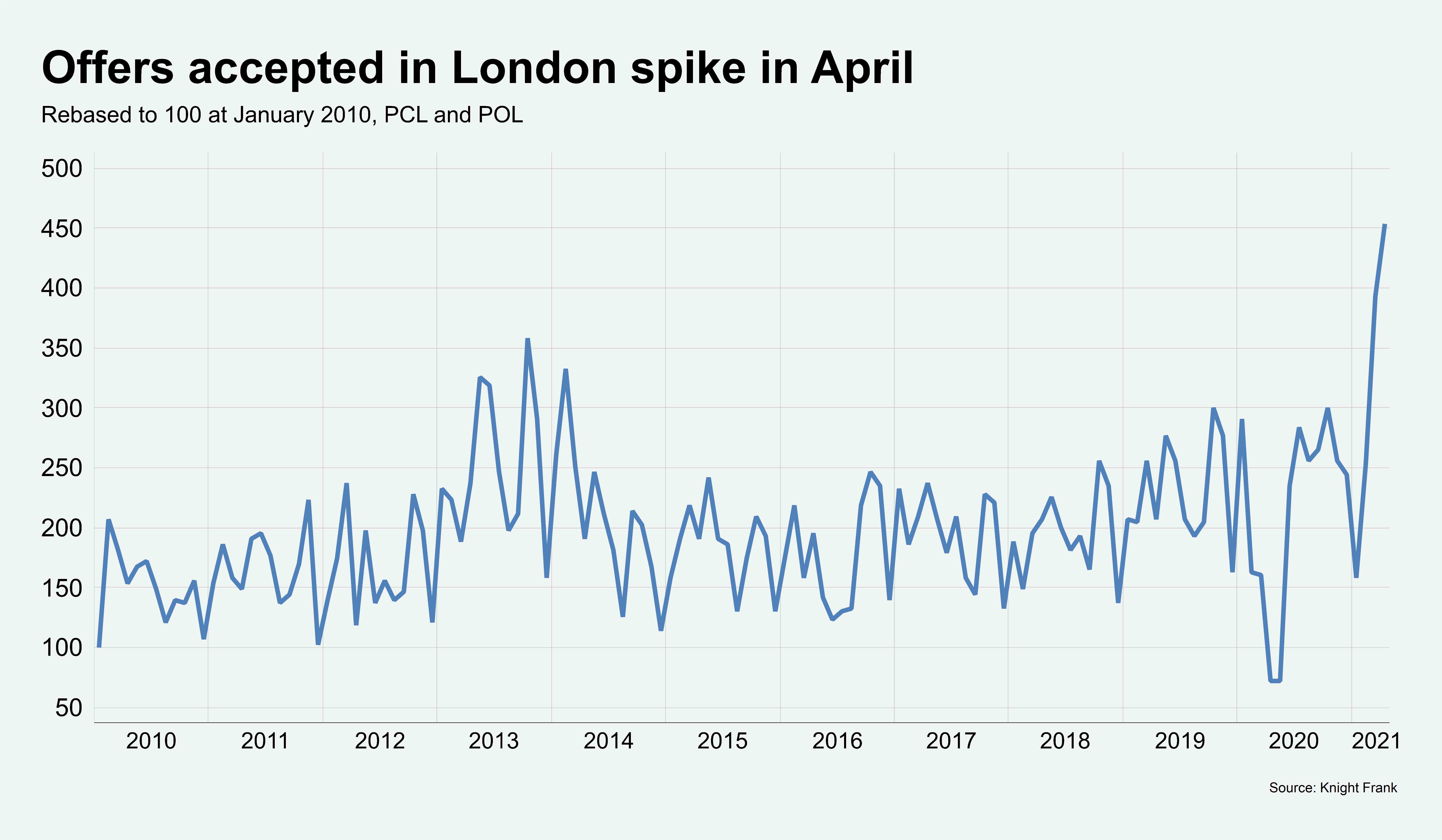 The number of offers accepted in prime central and prime outer London reached its highest level in a decade in April, as the chart below shows.
