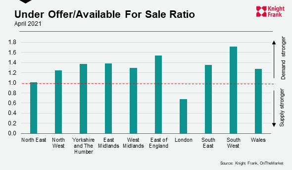 The ratio was 0.7 in London in April this year, which was the lowest of all the regions, marginally up from 0.6 in March 2020. It was also the only region where the number of properties under offer in April was lower than the total available to buy, as the below chart shows.