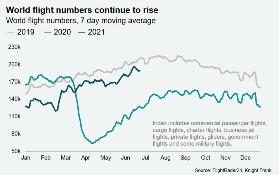 - Global air travel returns. Flight numbers have seen a steady rise this year, and in recent weeks have remained just a few percentage points below equivalent figures in 2019. This coincides with 23% of the global population now having received at least one dose of a COVID-19 vaccine. In the UK, that share has reached 65%.