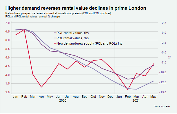 Stronger demand is helping to reverse the rental value declines that have taken place in prime London property markets over the course of the pandemic.