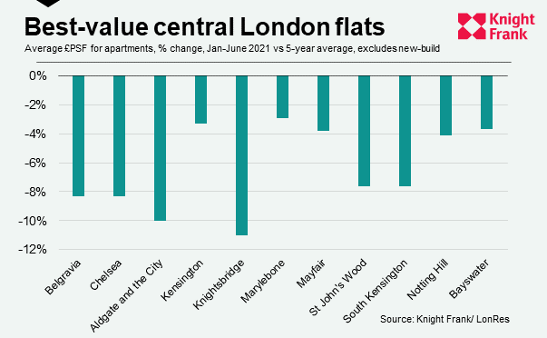 The average £PSF for a flat in Knightsbridge was £1,546 in the six months to June this year, which was 11% below the five-year average. An analysis of apartment prices, which excludes new-build property, shows this was the largest reduction in central London.