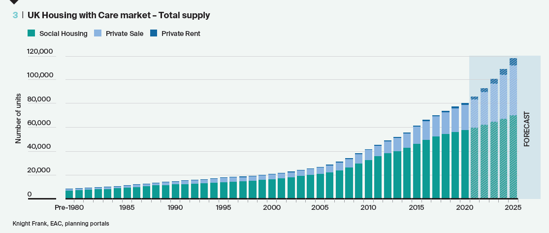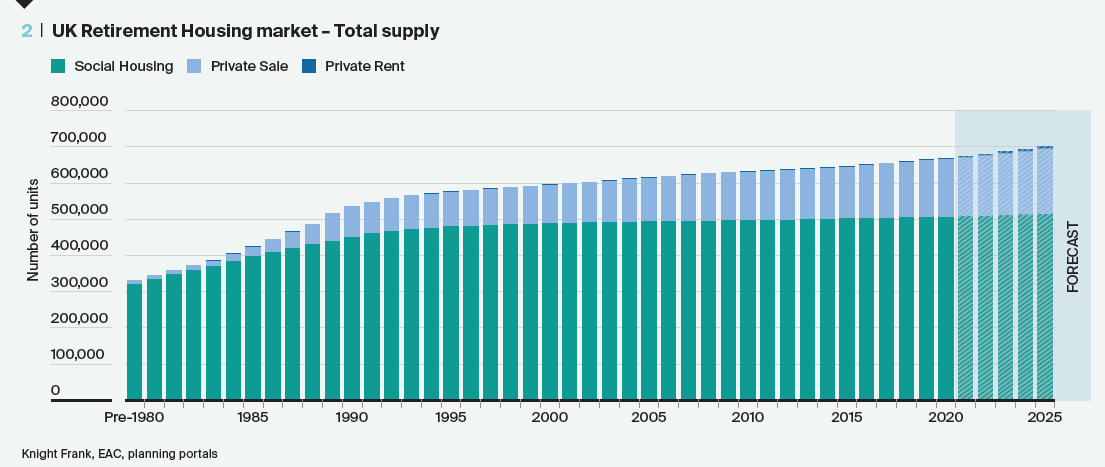 Consequently, we anticipate a 46% (or 37,450 units) increase in Housing with Care supply over the next five years. This is compared with 5% (or 32,650 units) growth in Retirement Housing.