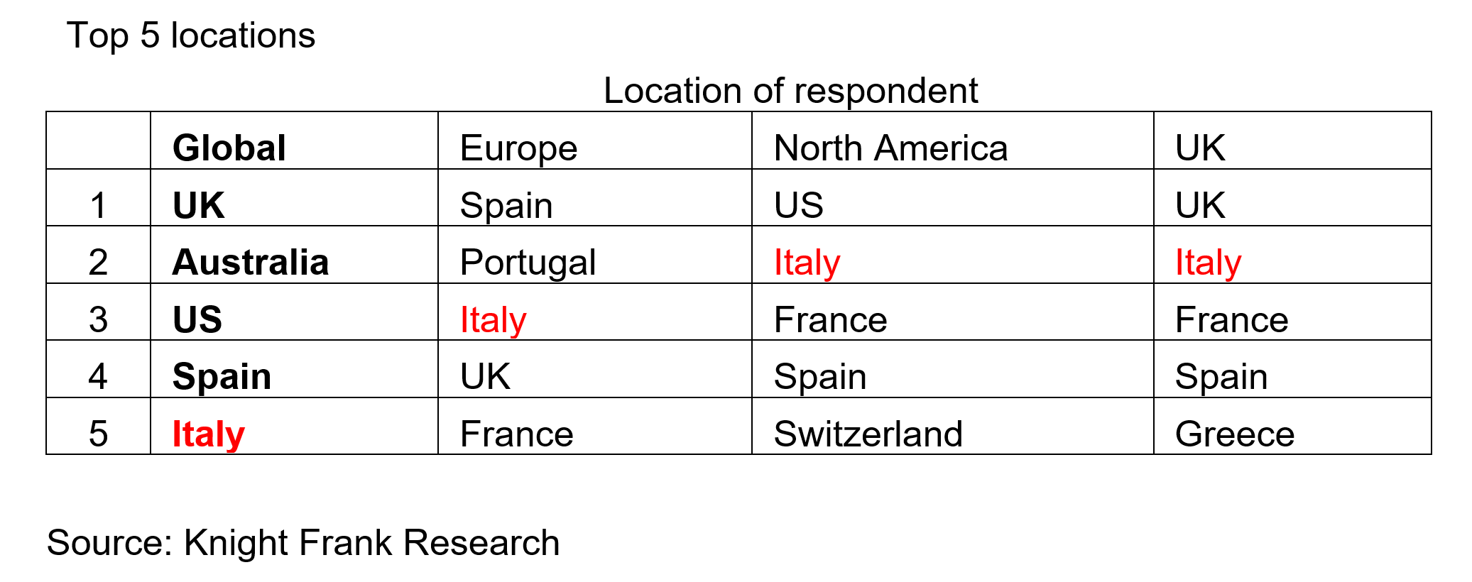 Knight Frank’s Global Buyer Survey which collated the views of over 900 clients found that Italy was among the top five top second home destinations amongst global respondents and also ranked highly with UK, European and North American buyers in particular.