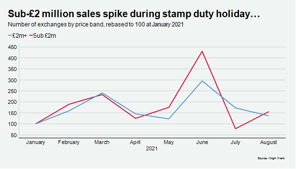 Following the substantial winding down of the holiday in June, the number of sub-£2 million exchanges in July was 30% below the same month in 2019. By August, the equivalent decline had narrowed to 5%, Knight Frank data shows.