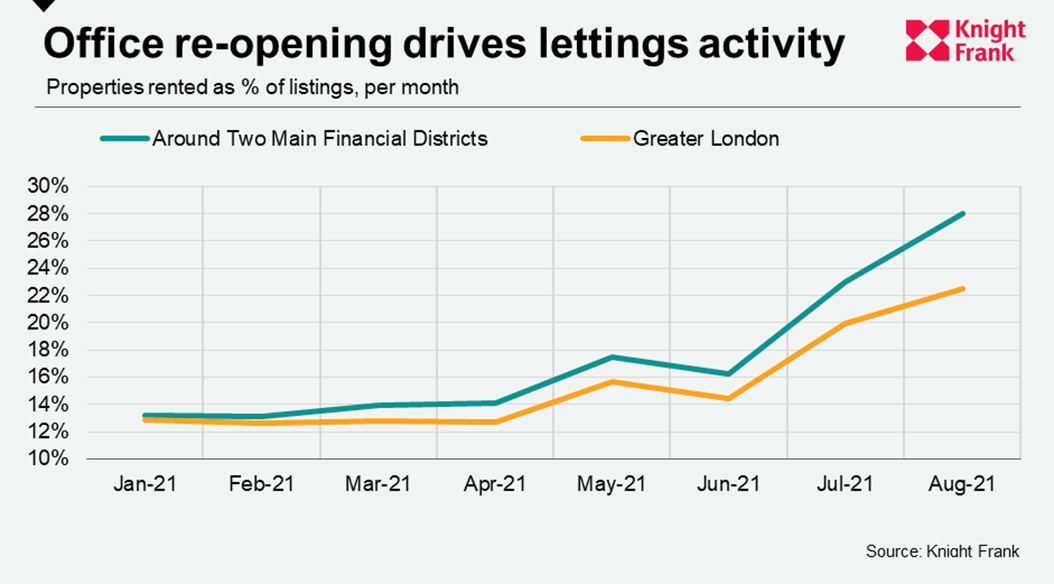 While 22.5% of Greater London listings were rented in August, the figure was 28% in areas around the two financial districts.