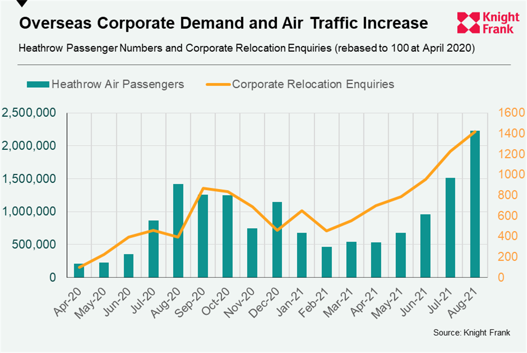 The first shows how corporate relocation enquiries and Heathrow passenger numbers have tracked each other through the pandemic. The enquiries come from companies of all sizes looking to relocate staff to the UK across a range of sectors including finance, tech and energy.