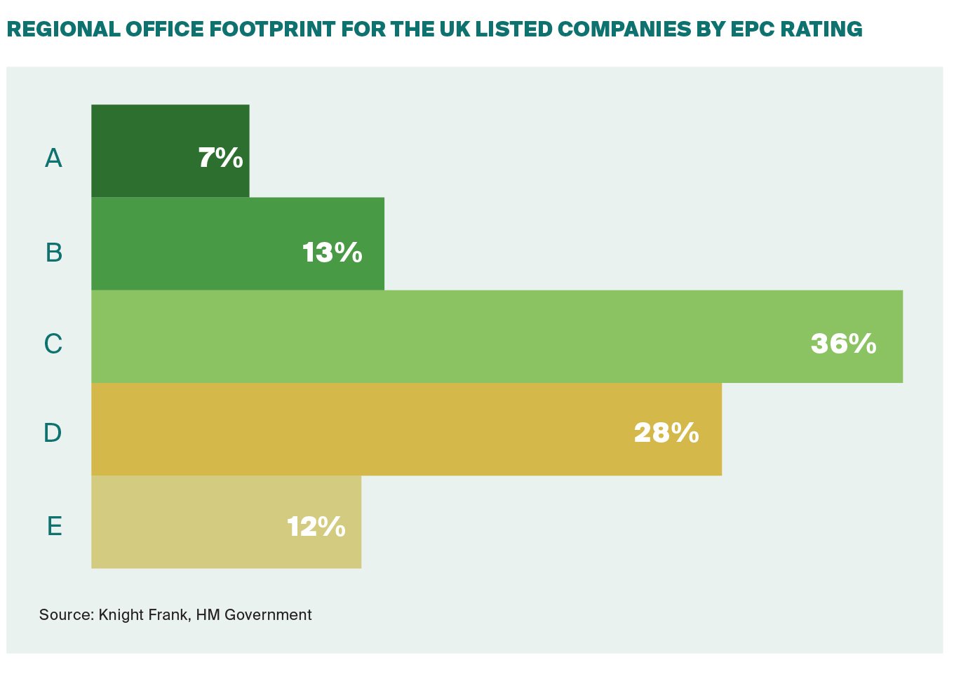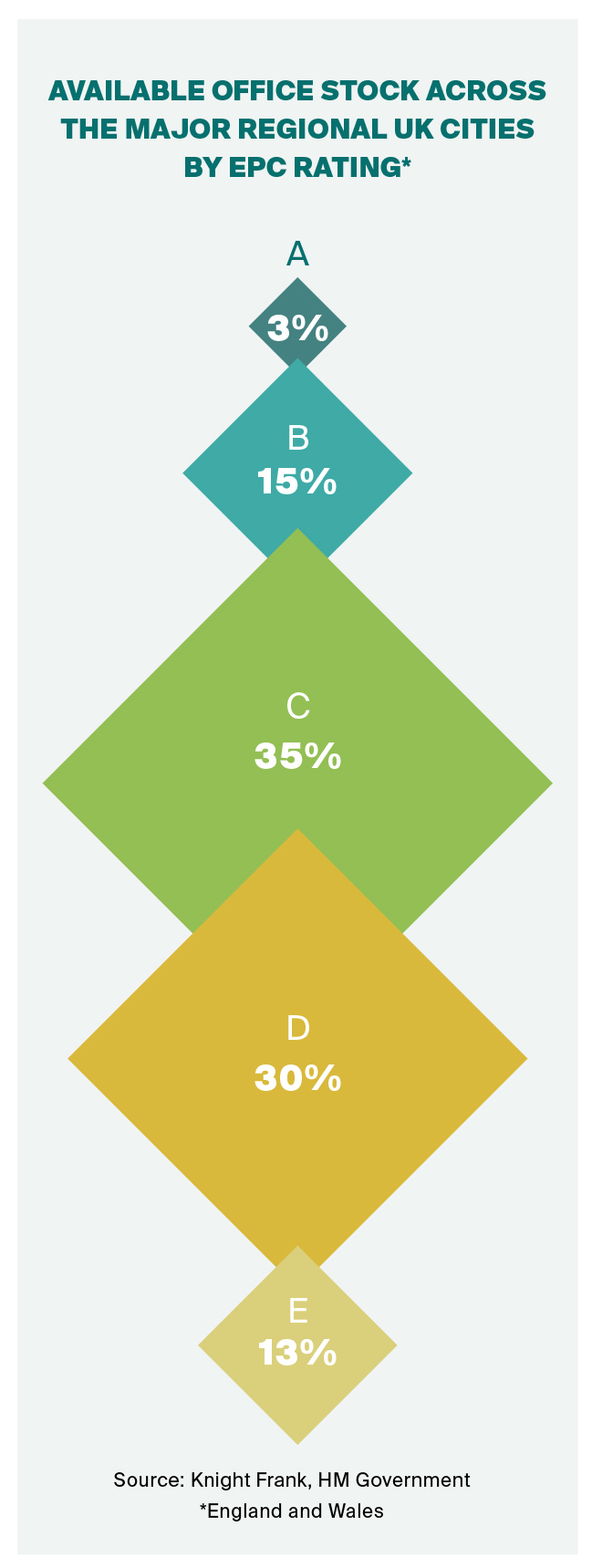 Our analysis found just 20% of offices occupied by UK listed companies in the UK regional cities hold an EPC rating of A or B.
