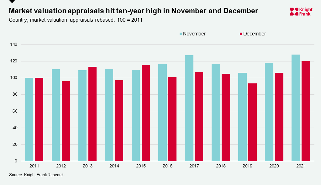 There are increasing signs that sellers, some put off by a lack of purchase options last year in a frenzied market during the stamp duty holiday, are looking to sell in 2022. The number of market valuation appraisals, a leading indicator of supply, was at its highest for a decade at the end of 2021 (see chart).