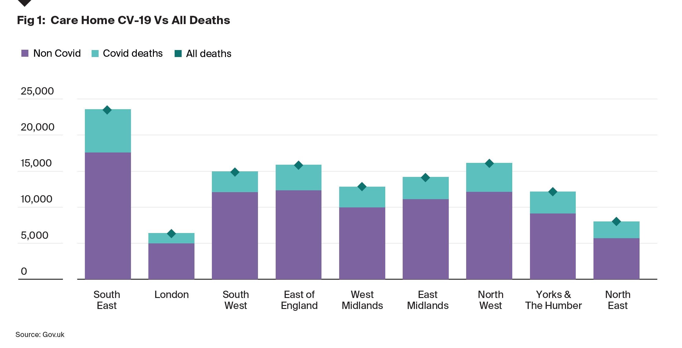 The outbreak of Covid-19 and the UK healthcare sector’s response to such unprecedented circumstances have highlighted the sector’s continued resilience and robustness. As per Figure 1, we can see the consistency in the management of care home deaths that occurred because of Covid-19 cases. This suggests that whilst occupancy was impacted by the virus, the significant fall is likely to result from the restrictions to admissions imposed during lockdown periods.