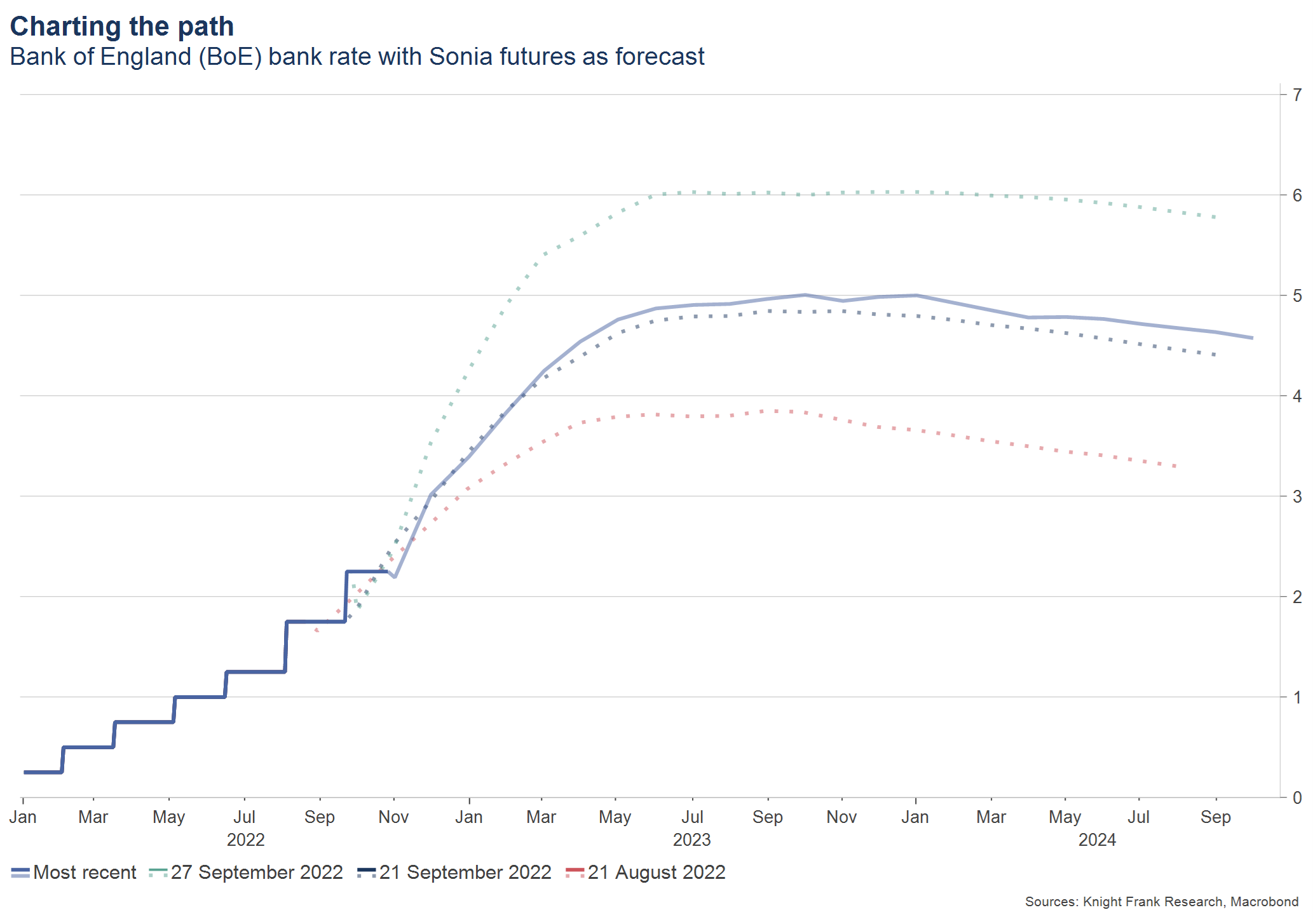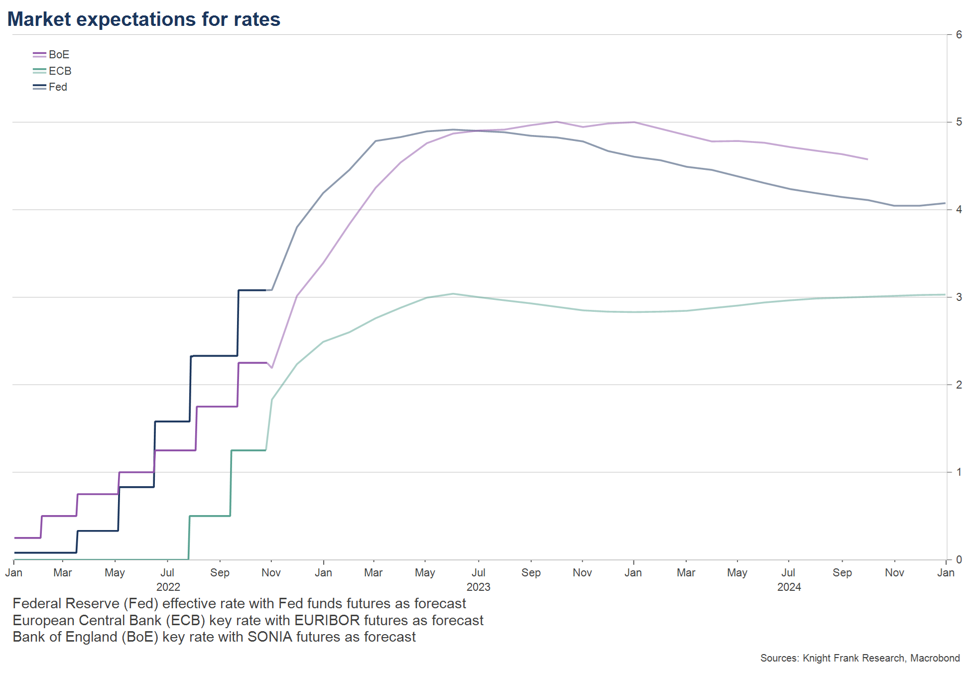 Some are already seeing price decline as my colleague Kate Everett-Allen pointed out . But the path for rates indicates that pressures will alleviate by early 2024. Rates have made a step up and won’t return to the lows of the past decade but, notwithstanding any inflationary shocks, there will be some respite from the current levels.