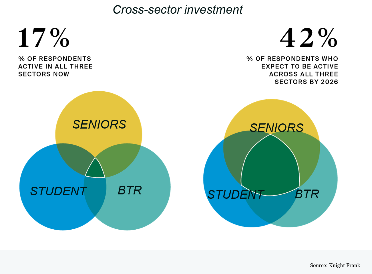 Our Residential Investment Survey, which represents the views of 54 institutional investors that manage £76 billion in residential assets across the UK (including student and BTR) showed that while only 31% of respondents are currently active in the Seniors Housing sector, 67% expect to be active in five years’ time, the largest projected increase of any sector in the survey.