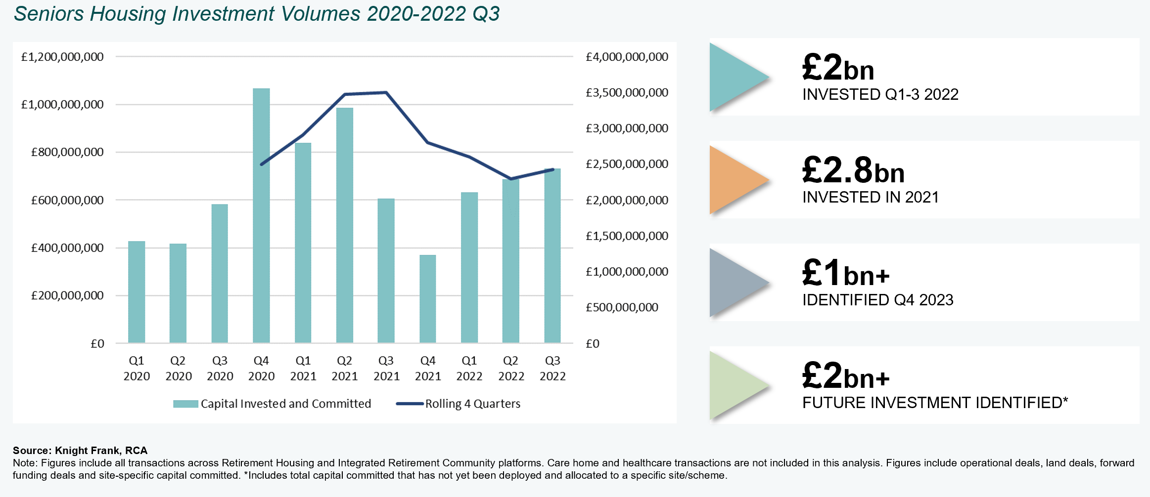 The volume of capital targeting the UK Seniors Housing market has continued to grow so far in 2022. In the first nine months of the year, more than £2 billion was committed to the sector.