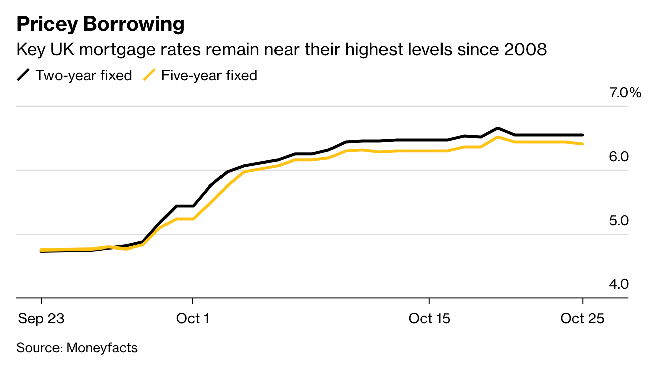 This looks like a market stabilising rather than any meaningful reverse. Average two-year fixed rates across all LTVs now sit at 6.54%, down from 6.65% last week, according to Moneyfacts data covered by Bloomberg (see chart).