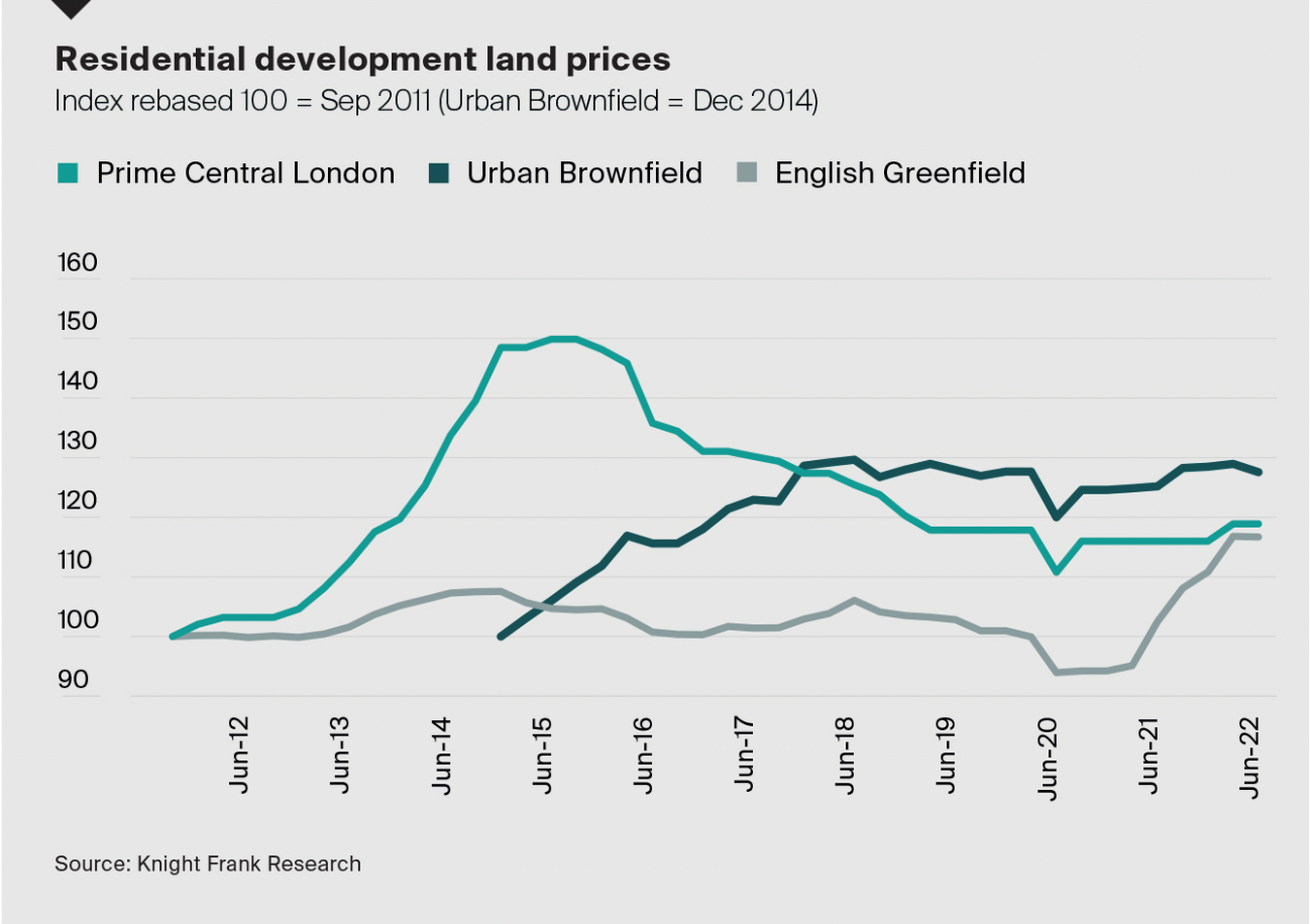 A shortage of residential development land has underpinned prices across the UK in recent years. Greenfield land remained the strongest performer during the year to Q2, up 13.9% annually, followed by PCL (+2.5%) and urban brownfield (+1.9%) (see chart).