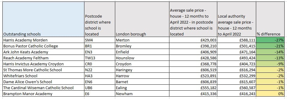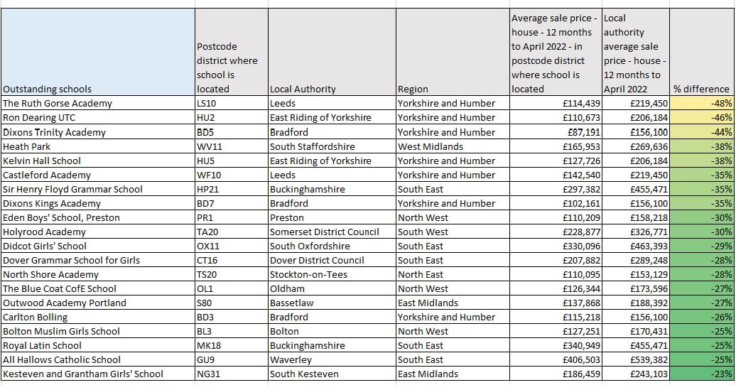 We analysed more than 500 outstanding-rated secondary schools in England and compared the average sale price for a house within 2km of the respective postcode district to the local authority average. We were then able to identify the top 20 areas offering the biggest relative discount.