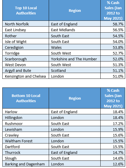 Meanwhile, the list of areas where cash buyers are most prevalent has a distinctly second-home feel and is topped by the coastal areas of North Norfolk (59%), East Lindsey (57%) and Rother (55%). Relatively higher levels of retiring homeowners are also likely to have affected the figures.