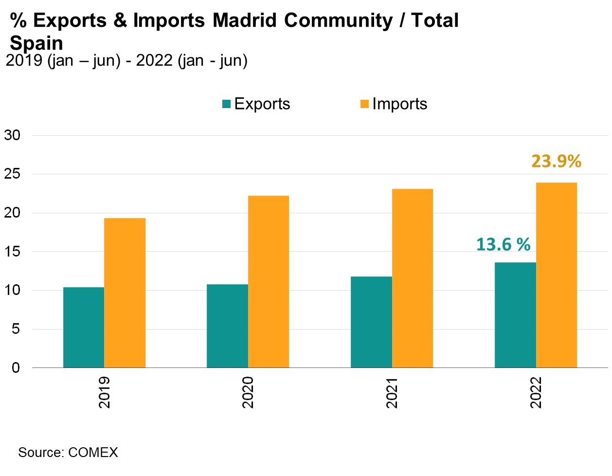 According to the last figures published in the report of the Comercio Exterior del Gobierno de España, the capital city accounted for 13.6% of the total export, with 44.5% year-on-year growth, during the first six month of the year. While the import registered around 24% of the total and an annual variation of 41.4%.