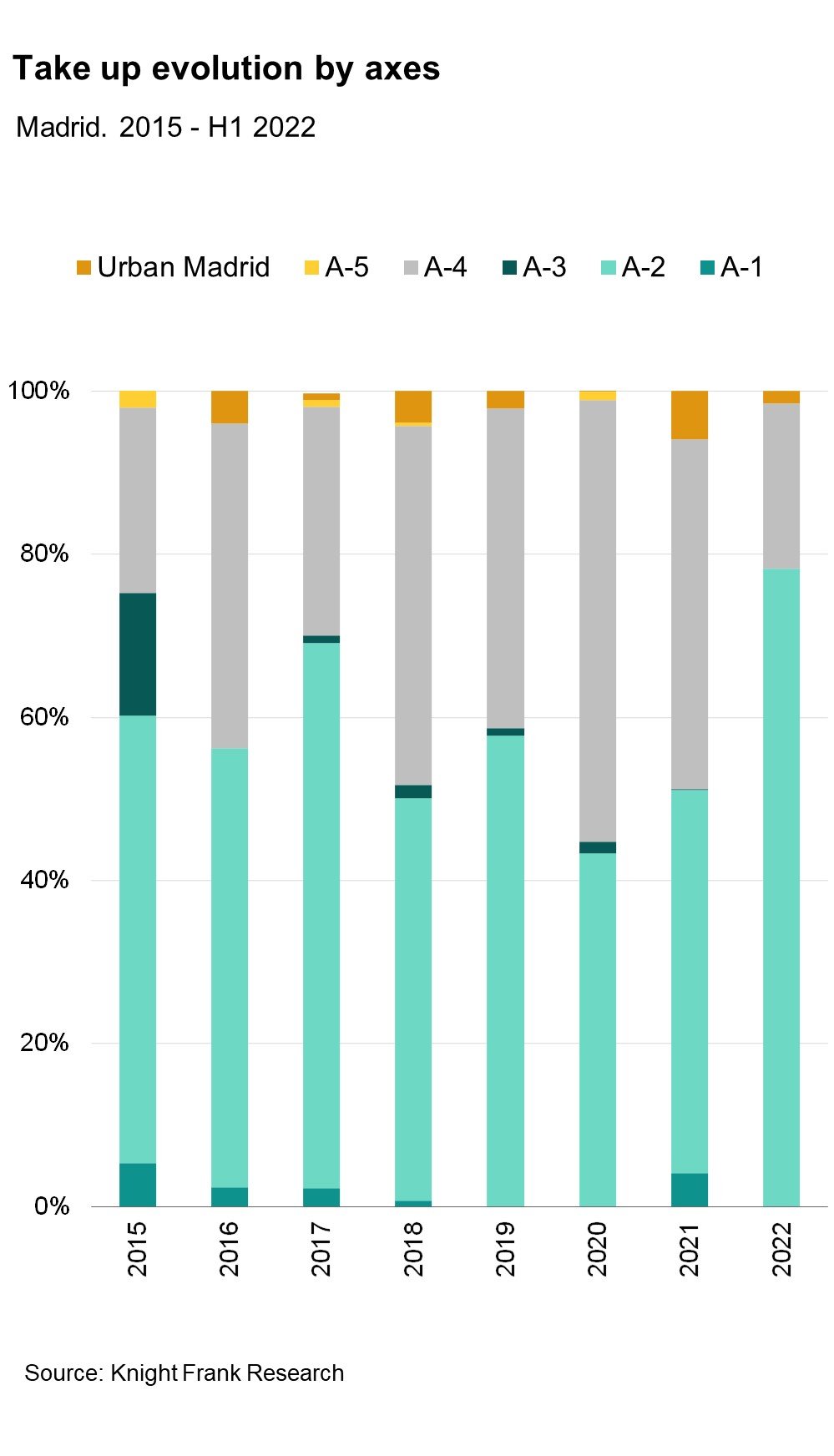 The axes of A3, A4 and A5 form the southern area with municipalities such as Rivas, Getafe o Alcorcon. The take up level in the A4 zone also has a high demand, similar to the A2 zone.