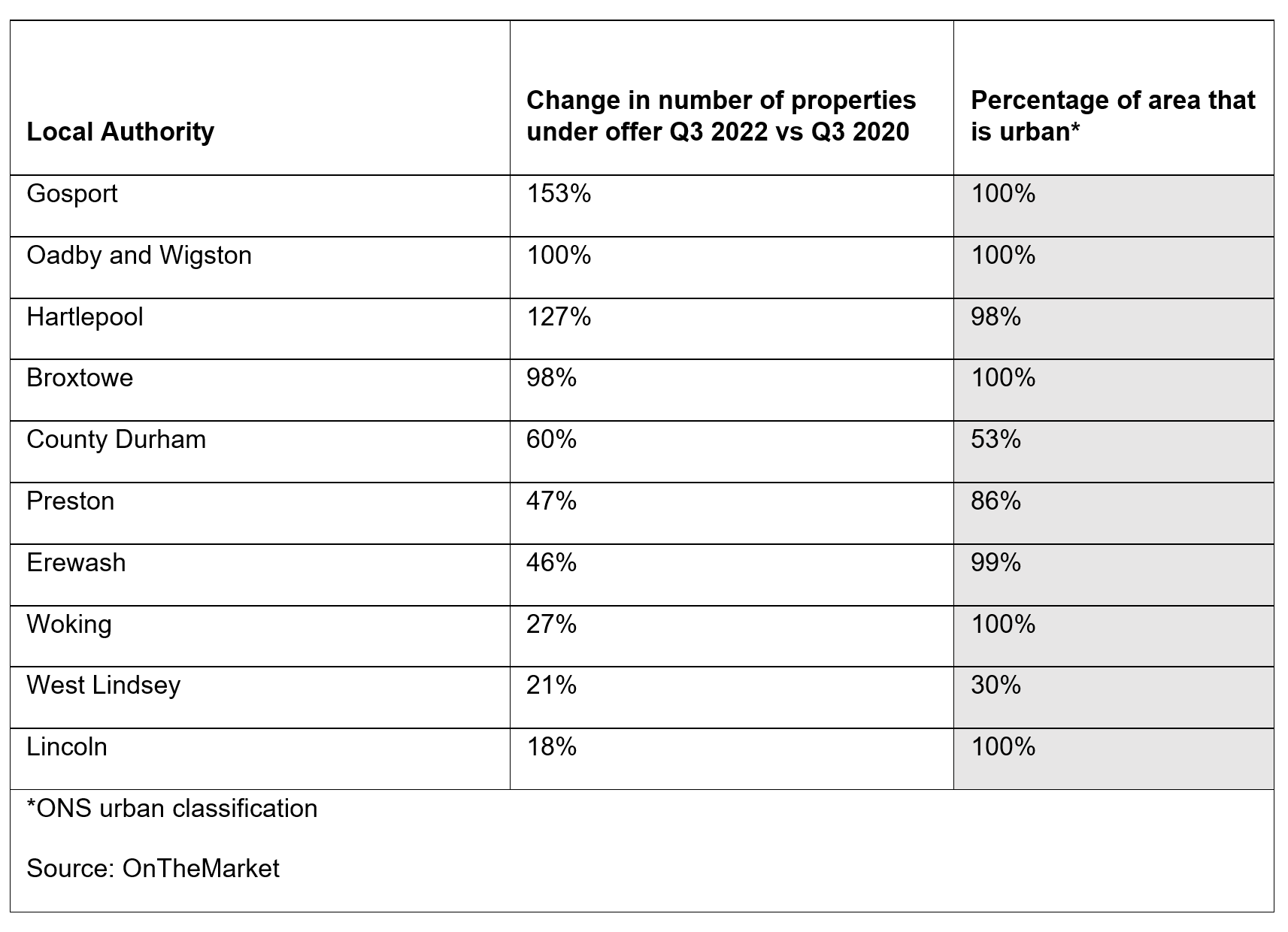 This shift back to more urban areas with a shorter commute can be seen right across the UK. Compared with the peak period for the “escape to the country” trend in Q3 2020, nine of the top ten areas in England and Wales that have seen the largest increase in properties under offer since are classified as majority urban (see table), OnTheMarket data shows.