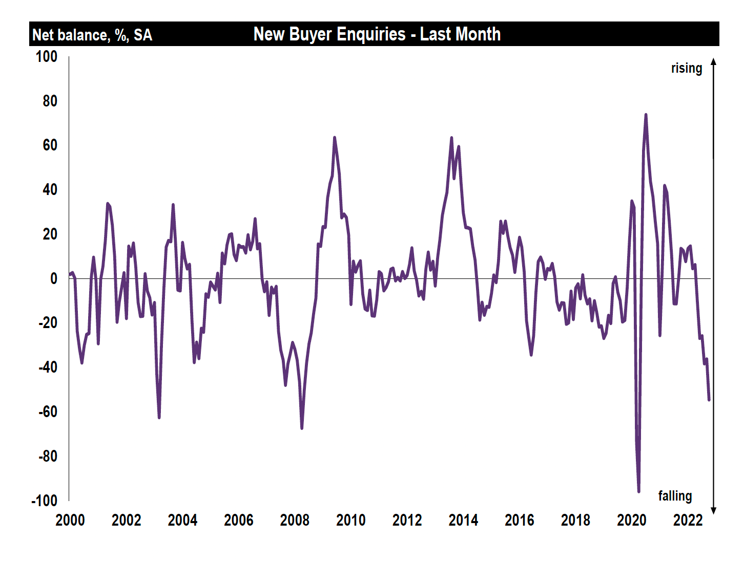 The latest RICS Residential Market Survey offered more confirmation that October was a particularly bad month for the UK housing market. The measure of new buyer enquiries fell for a sixth consecutive month to hit a net balance of -55, the lowest reading since the depths of the pandemic (see chart).