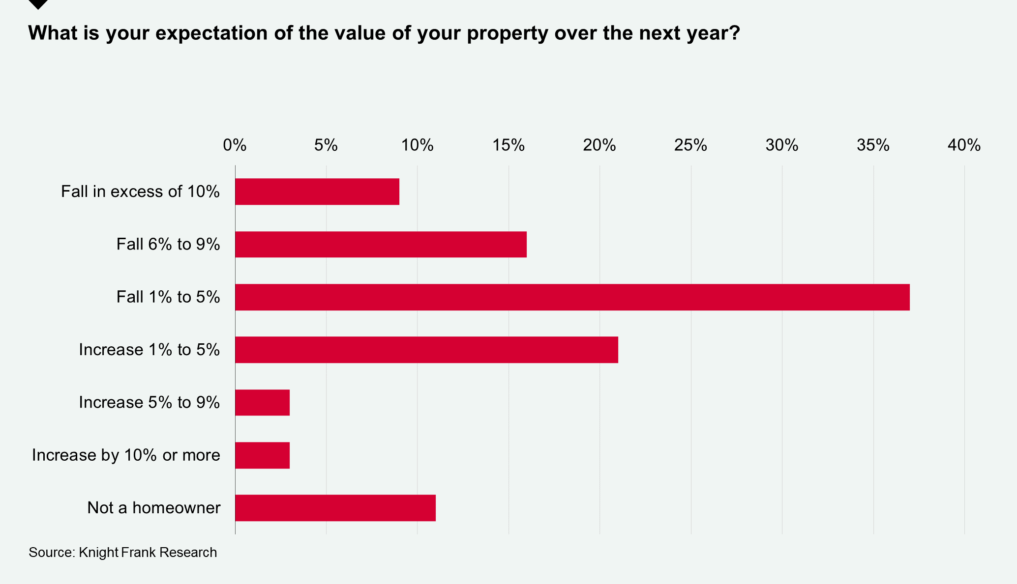 The majority (62%) of respondents expect the value of their home to fall over the next year, with most anticipating a decline of 1% to 5%, which was selected by over a third (see chart).