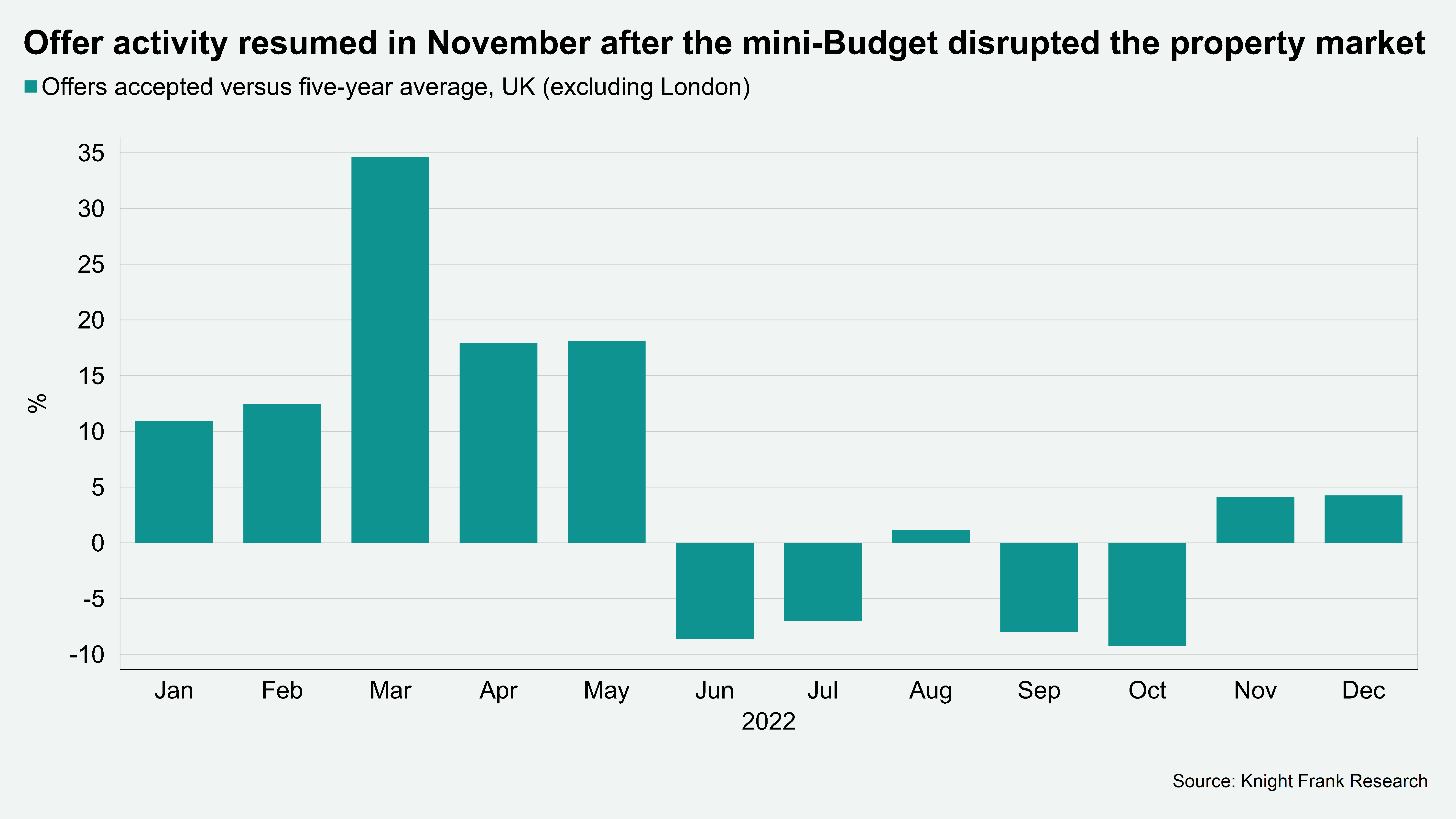 Accepted offers were up 4.1% versus the five-year average in November and by 4.3% in December, after a dip of 9% in October (see chart). June deal volumes, and to a lesser degree July and September, were negatively affected by comparison to 2021’s stamp duty deadlines.