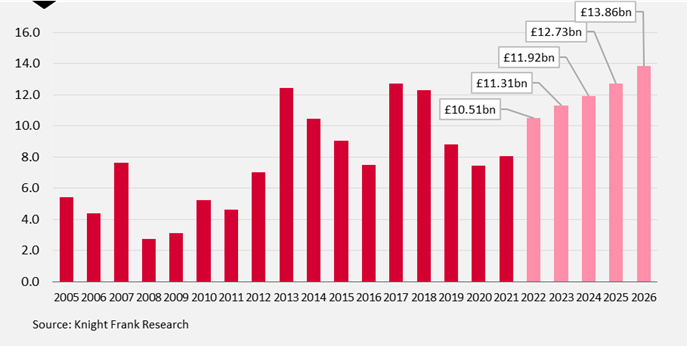 Investment transactions in London offices reached £12.3 billion in 2021, a year-on-year rise of £3 billion and the highest annual change since 2017. This came despite a background of rising long-term interest rates and the new Omicron variant bringing rising infection rates, continued disruption to international travel and a return to more remote working.