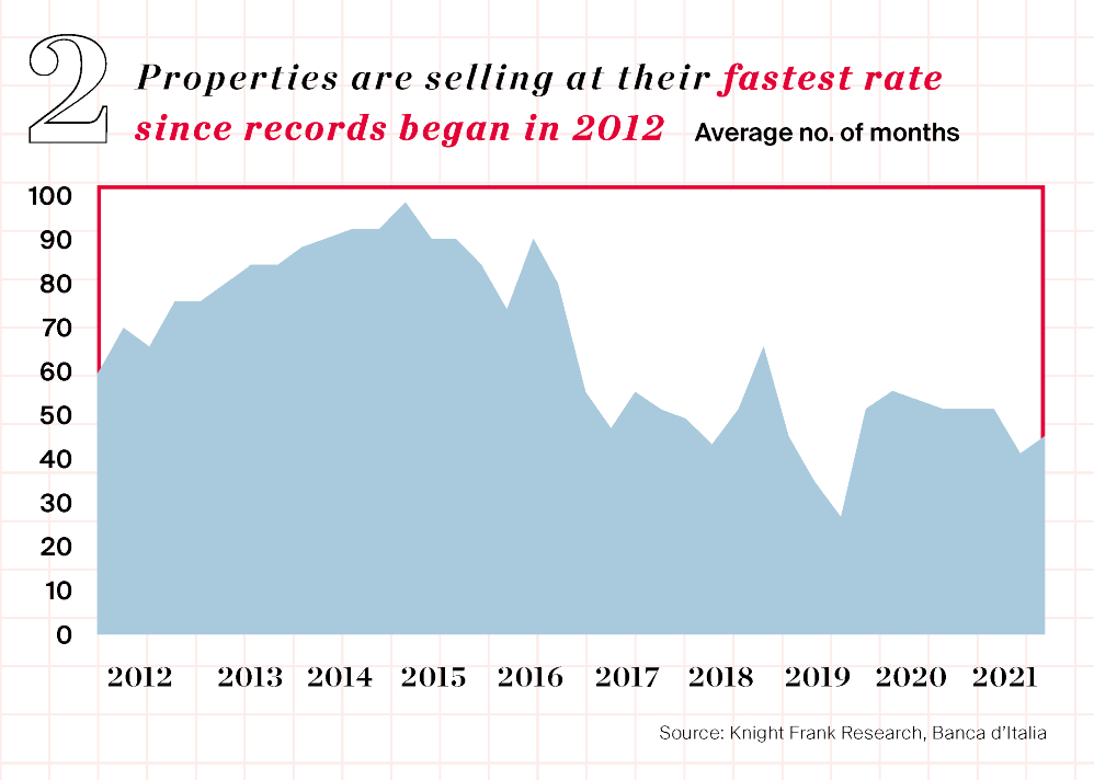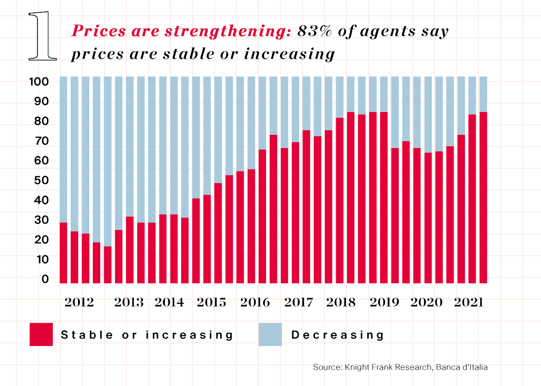 Long defined by high inventory levels which resulted in softening prices, Italy’s prime residential markets are now registering steady annual price growth and contrary to the headlines, it’s not all focused on rural or resort-led markets, cities such as Lucca and Venice were amongst some of the top performers in 2021. We expect urban living to be back in the spotlight in 2022 as the world starts to recalibrate and buyers reconnect with all that cities have to offer, from art and history to culture and cuisine.
