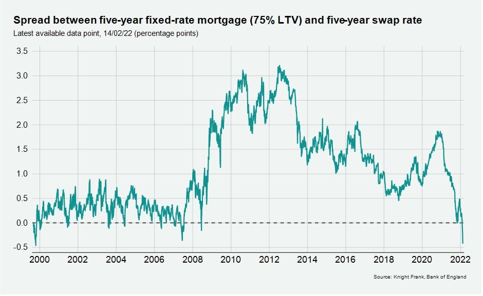 While the five-year swap rate was 2.064% on 15 February, the average five-year fixed-rate mortgage at a loan-to-value of 75% was 1.64% at the end of January, Bank of England data shows.