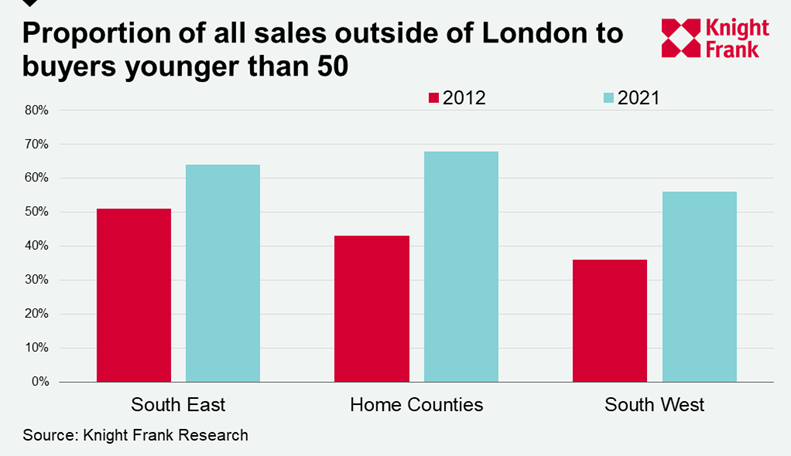 The proportion of sales outside of London to buyers under 50 has increased from just under half (48%) in 2012 to 60% last year, as families move from cities such as London at an earlier stage in life.