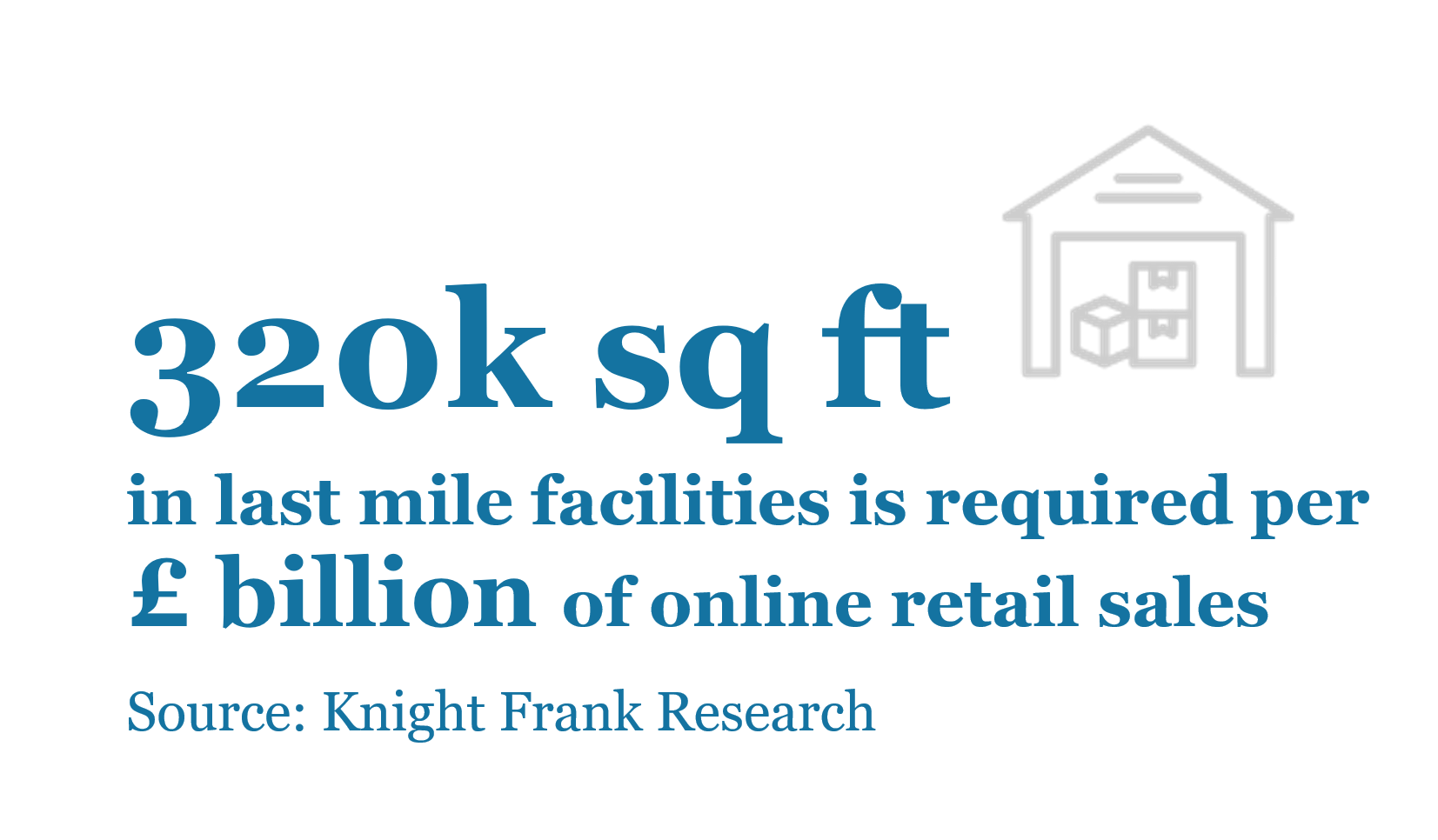 In our ‘Future Gazing’ research, we analysed the distribution networks for online retailers that tend to operate a hub-and-spoke model and found that they typically allocate 20-25% of their total warehouse footprint to last mile or spoke facilities. Our analysis shows that each additional billion pounds of online retail sales requires 320,000 sq ft space in last mile or spoke facilities.