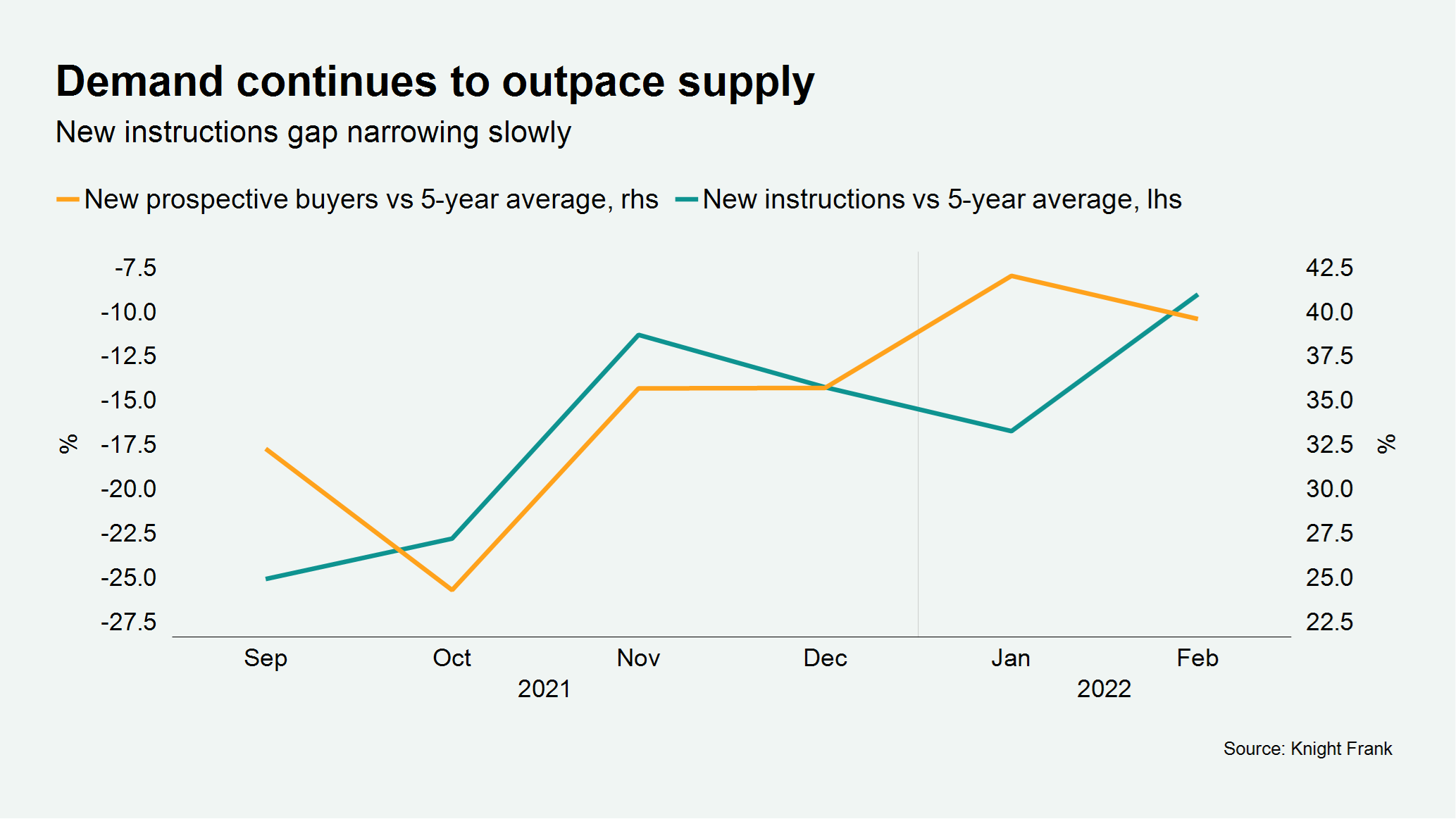 However, with supply depleted after a record 2021 that saw a stamp duty holiday and the escape to the country trend in full force, some sellers remain reticent to list their properties due to a perceived lack of purchase options, despite the arrival of spring.