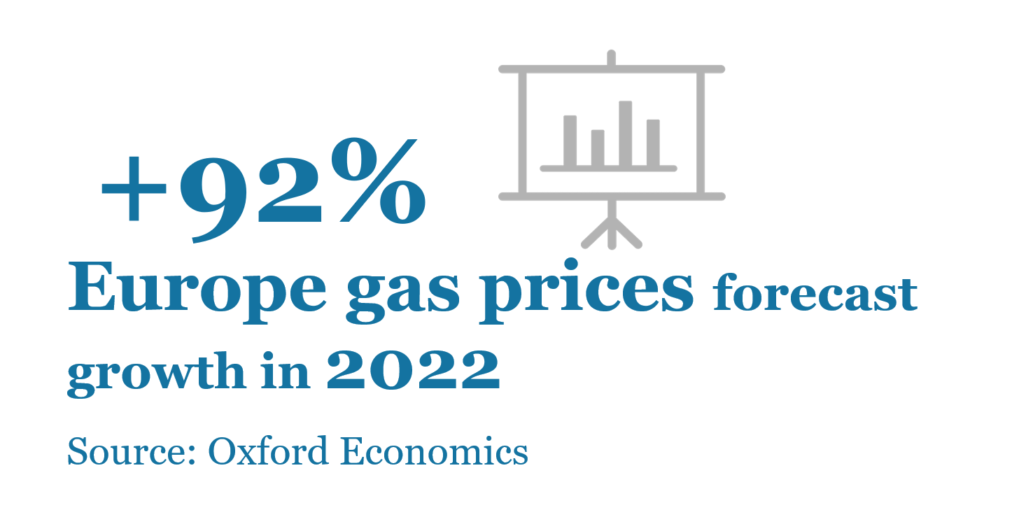 The cost of energy has increased significantly throughout the end of 2021 and into 2022. The current geopolitical tensions threaten to fuel further price growth throughout the rest of 2022. Oxford Economics forecast world energy prices to increase 33% in 2022, following a 120% increase in 2021. Gas prices in Europe have risen sharply in recent months and are expected to rise 92% this year. Meanwhile, oil prices are expected to rise 42% in 2022, following 69% growth last year (2021).