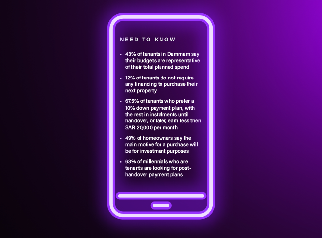 Over a third (35%) of tenants nationwide said their budgets were representative of their total expected spend, rather than being representative of just a down payment. Average two-bedroom apartments in Riyadh, of a good quality, sell for over SAR 750,000, while three or four-bedroom villas usually sell for in excess of SAR 2.3 million, highlighting the discrepancy between tenants’ ambitions and market realities.