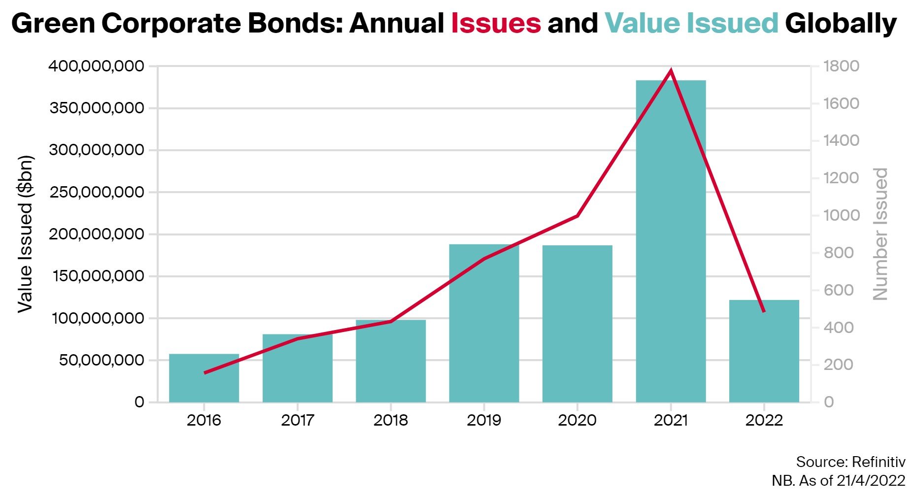 According to data from Refinitiv, 2021 saw the value of green corporate bonds issued globally rise by more than $200bn, smashing the record set in 2019. Indeed, we appear to be set for another bumper year. The year-to-date total (as of 21st April 2022) has surpassed $120bn – more than was issued annually in both 2017 and 2018.