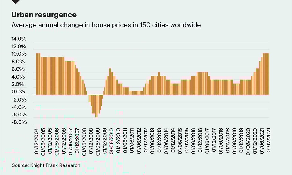 Cities in the Americas registered the strongest jump averaging 15% annual growth compared to 11% in the EMEA region and 9% across Asia-Pacific. US households not only accrued significant savings during successive lockdowns but the equity in their homes expanded significantly too. In some cases, this wealth has been used to upgrade existing homes or purchase a second property.