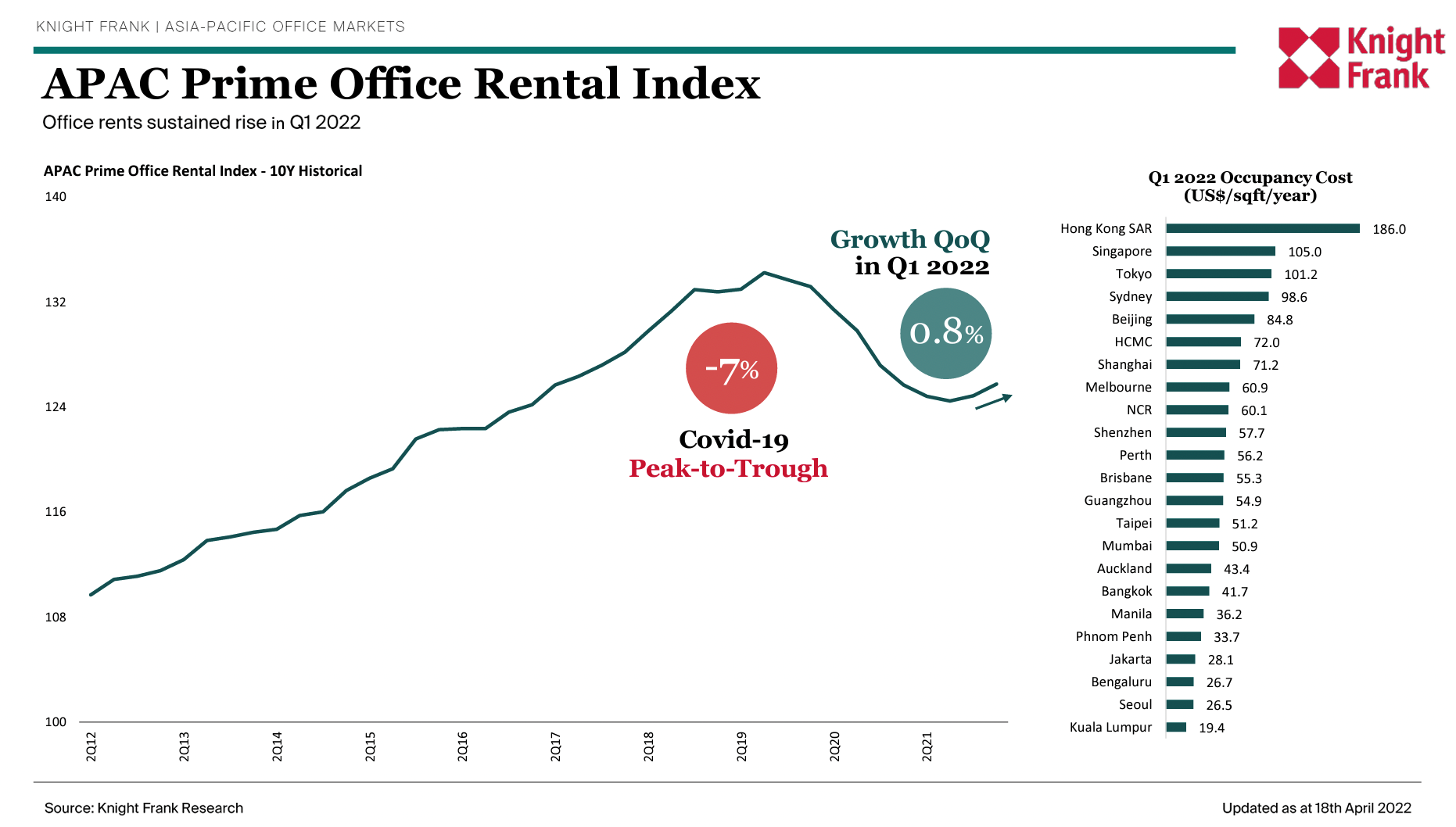 Leasing demand for offices across Asia Pacific is fast improving. Some 21 cities tracked by our index recorded stable or rising rents in the first quarter, up from 13 in the previous quarter.