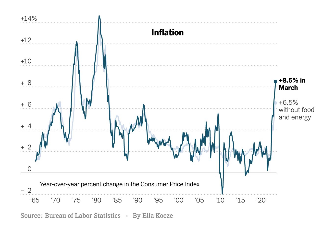 The latest inflation figures from the US look bad at first glance - the headline annual rate hit 8.5%, the most since 1981. However, strip out energy and food and the rate of price rises slowed slightly in March, largely due to easing in the used car market (see chart below courtesy of the NYT).