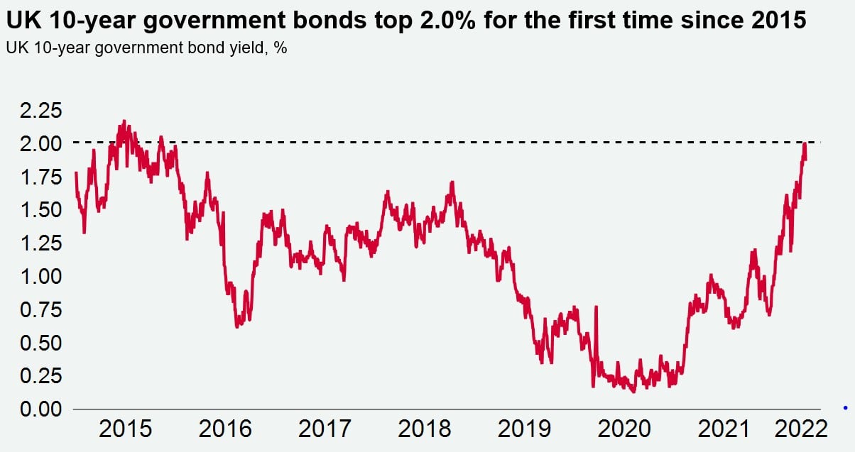 Money markets predict central banks in the US, UK and Europe will heed the IMF’s warning and begin to raise interest rates in a more aggressive manner. The US Federal Reserve is expected to increase rates by 50bps at each of its next three meetings, culminating in a 2.7% interest rate by year end. In the UK, the Bank of England is expected to raise rates to 2.25% over this time. Meanwhile, markets predict 85bps worth of interest rate hikes from the European Central Bank this year, bringing the rate into positive territory for the first time since 2014.