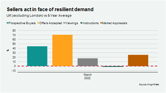 Meanwhile, demand and the pipeline of sales remains strong. Offers accepted were up 71% in March versus the five-year average, and last month saw the most offers accepted outside of London since October 2020.