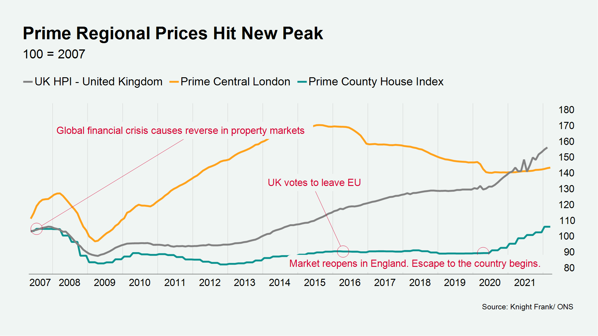 However, it has underperformed the mainstream and prime central London (PCL) markets in the period since 2007. Mainstream property values have increased 48% since the third quarter of 2007 (to February 2022), and PCL by 16.5% over the same period. The fact average prices in the country have only just recovered to their 2007 level suggests there remains headroom for future growth.