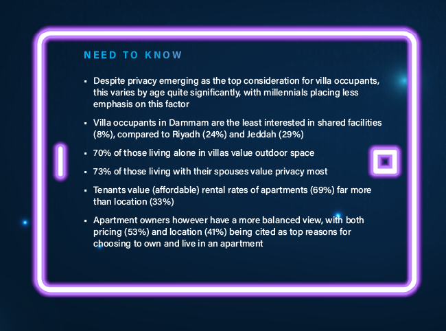 The importance of privacy amongst those living in villas transcends geography, with those in Riyadh (66%) valuing privacy as much as those in Jeddah (71%) as well as Dammam (73%).