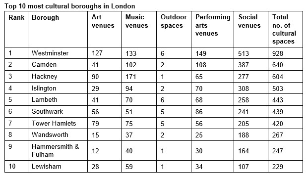 London’s top 10 boroughs for culture are Westminster, Camden, Hackney, Islington, Lambeth, Southwark, Tower Hamlets, Wandsworth, Hammersmith & Fulham, and Lewisham.