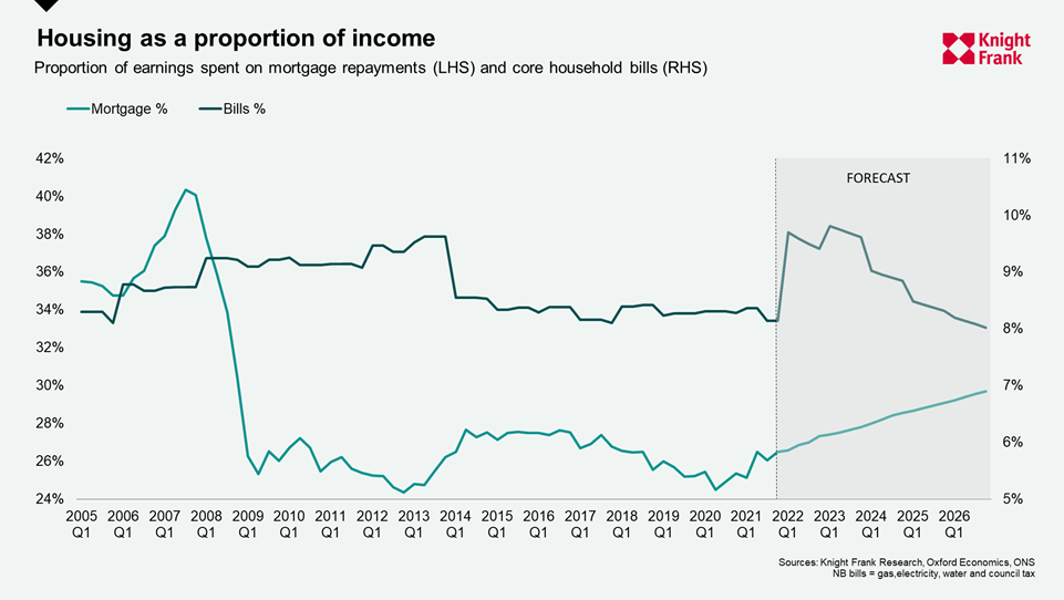 Now: With cost of living rising as energy costs surge, we have revisited our previous analysis. Utilising our latest house price forecasts and Oxford Economics forecasts for mortgage rates and wage growth, the proportion of income spent on servicing a mortgage is expected to rise to 30% by 2026.