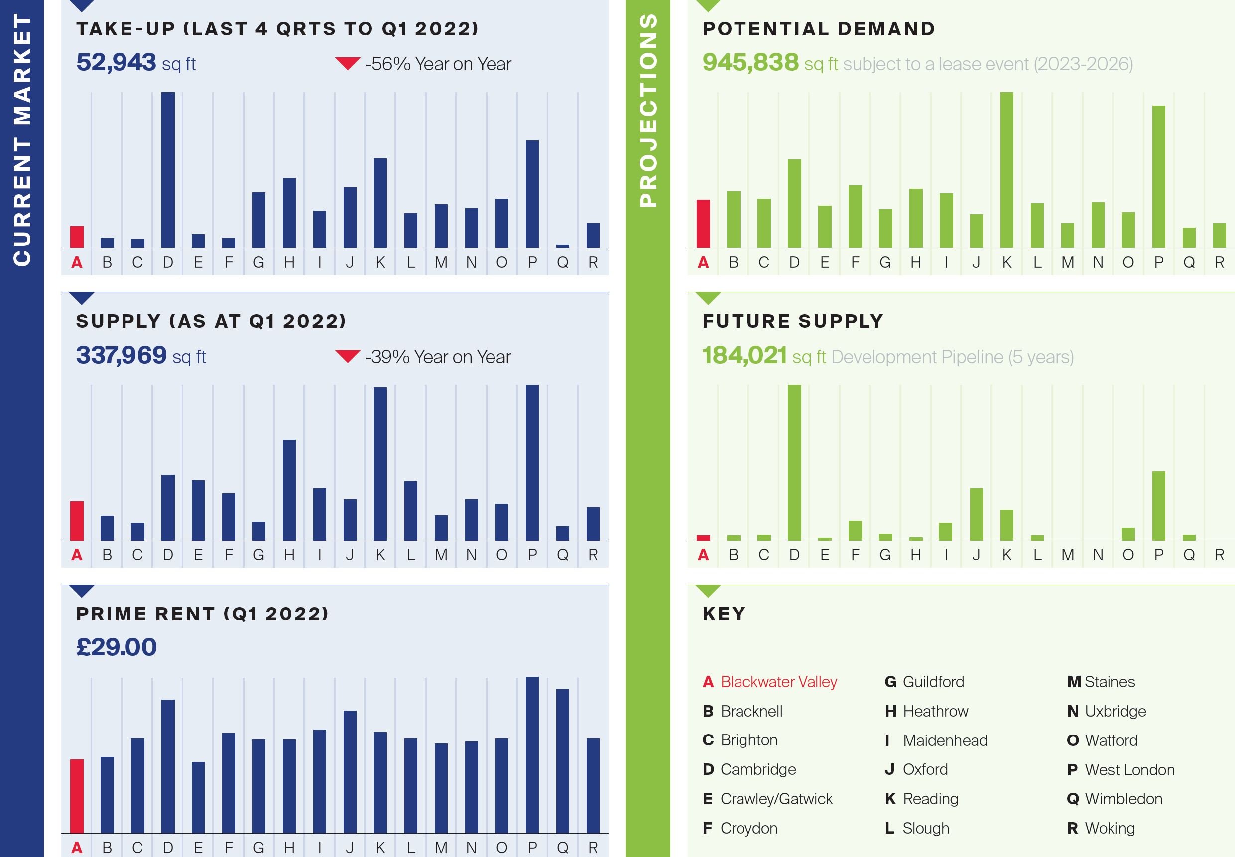 The Blackwater Valley had registered about half of its usual annual take-up in 2021. The key transactions of note have been in Farnborough (its key office location/hub), notably with Siemens moving from Frimley to Farnborough Business Park on c.30,000 sq ft at £28.50 per sq ft Q2 2021. There was additional activity in Hook at the bottom of the BWV where Cinch Cars (sponsors of almost everything in 2021 from Latitude Festival to Tottenham Hotspur) elected to set up a regional HQ of c.25,000 sq ft at Kennedy Wilson’s Form, Bartley Wood scheme. A little further afield in Basingstoke saw Arena Business Centres take c.60,000 sq ft at Grosvenor House.