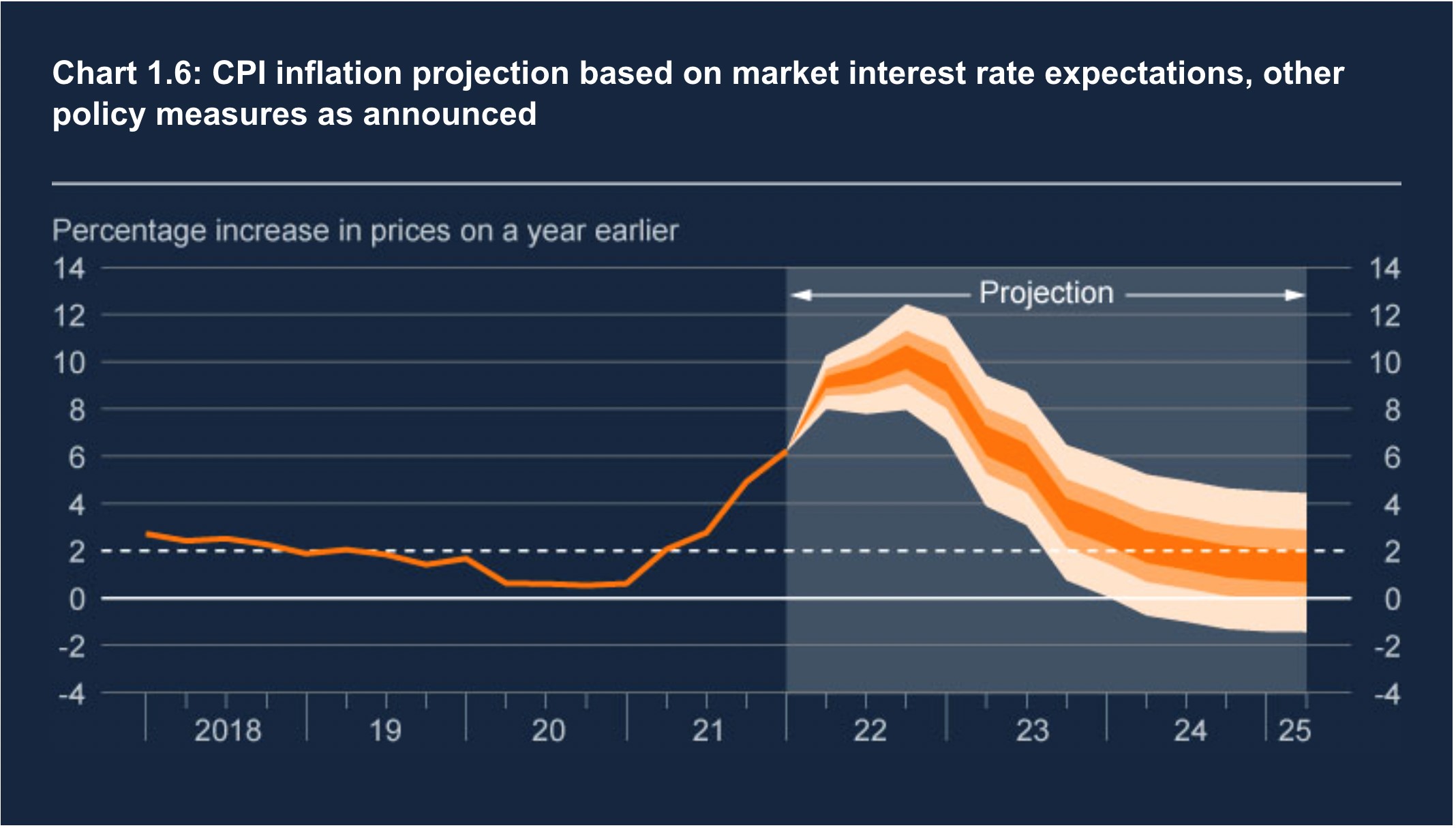 Projections published alongside the decision suggest that, from an economic perspective, we're in for a difficult 18 months or so. Inflation is set to peak at 10% later this year before falling back to the Bank's stated 2% target in about two years. The Bank maintained its forecasts for economic growth of 3.25% this year, but now believes the economy will contract 0.25% in 2023, down from an earlier forecast of 1.25% growth. It cut its growth projection for 2024 to 0.25% from a previous 1.0%. The pound endured its worst day for two years.